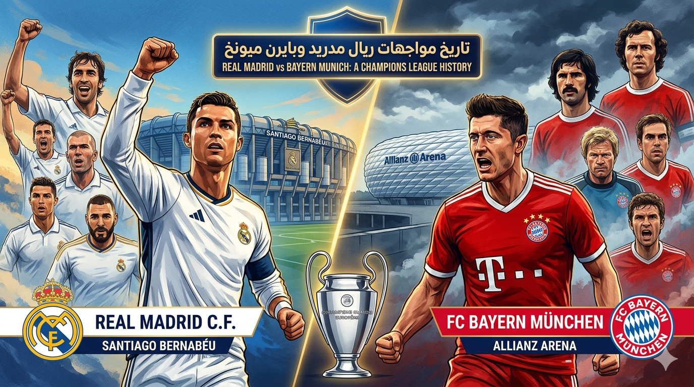 “استكشف تاريخ مواجهات ريال مدريد وبايرن ميونخ الكامل في دوري أبطال أوروبا. إحصائيات الانتصارات، الأهداف، وأسرار سيطرة الملكي التاريخية على العملاق البافاري.”